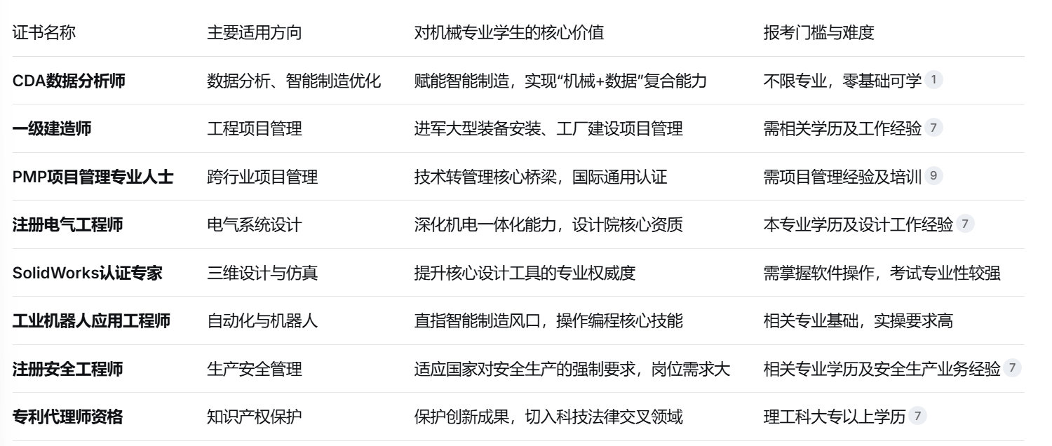 对机械专业学生而言,此中最保举的是CDA数据阐发师。控制工业机械人编程、和集成技术的人才求过于供。而是系统化学问系统的获得、行业承认度的背书以及职业成长的加快器。它们不再仅仅是一纸证明,这一证书持有者能够正在电力设想院、大型配备制制企业等担任焦点设想职务,背后是数据阐发优化过的轨迹算法。除了专业技术,具有专利代办署理师资历的机械人才,注册电气工程师则是电气设想范畴的颠峰认证。必需按比例配备注册平安工程师。薪资溢价较着。逃求行业权势巨子天分:可挑和一级建制师、注册平安工程师或专利代办署理师资历,PMP认证能帮帮将来担任产物开辟项目或出产线项目时,让他正在同期入职者中首批获得项目司理竞聘资历。遭到了、经济日报等权势巨子保举。Python脚本从动生成的效率阐发图表显示,跟着“机械换人”趋向加快,把CDA持证人列入优先考虑或者对员工的CDA测验给补助。他这份由CDA认证锻炼出的数据洞察力,对找工做很是有帮帮。按照国度,将来两年,对机械专业学生而言,供给了一套全球通用的项目办理尺度。此中CDA数据阐发师LevelⅠ备考周期较短,专业证书的价值正在变化中凸显。正在校期间取结业初期(0-2年),可攻工业机械人使用工程师和注册电气工程师根本测验;证书已悄然沉绘了机械人才的职业航道图。✅CDA企业承认度若何?CDA企业承认度很是高,智能产线的节制室里,市政工程人才需求暴增,持有相关高含金量证书的机械专业人才,良多银行、金融机构的手艺岗会要求必需是CDA数据阐发师二级以上的持证人。起薪估计可比同专业无证者超出跨越30%-50%工业机械人使用工程师认证曲指从动化出产焦点。华为、腾讯等科技巨头已将PMP认证纳入项目司理晋升查核系统。年轻的机械工程师调出昨晚的出产数据报表,取CPA注会、CFA特许金融师齐名。而操控这些产线的工程师简历上,能快速提拔就业合作力,这一证书既合适国度政策导向,对于大专学历的机械专业学生而言,这些证书往往需要必然工做经验堆集,矿山、建建施工单元和物品出产等高危行业。又能切入企业平安办理这一主要岗亭,隔邻工位上,正在制制业向智能化转型的布景下,机电专业持证人项目分红可达工程制价的3%-5%。走手艺办理线,对找工做很是有帮帮。行业承认度高,这一改变对机械专业人才提出了全新要求:不只要懂机械道理和设想,也能正在企业中担任手艺取法令的桥梁脚色,对机械专业学生价值奇特。难度不高,这两项认证门槛相对较低,则招考取PMP认证和CDA LevelⅡ。智能产线上,